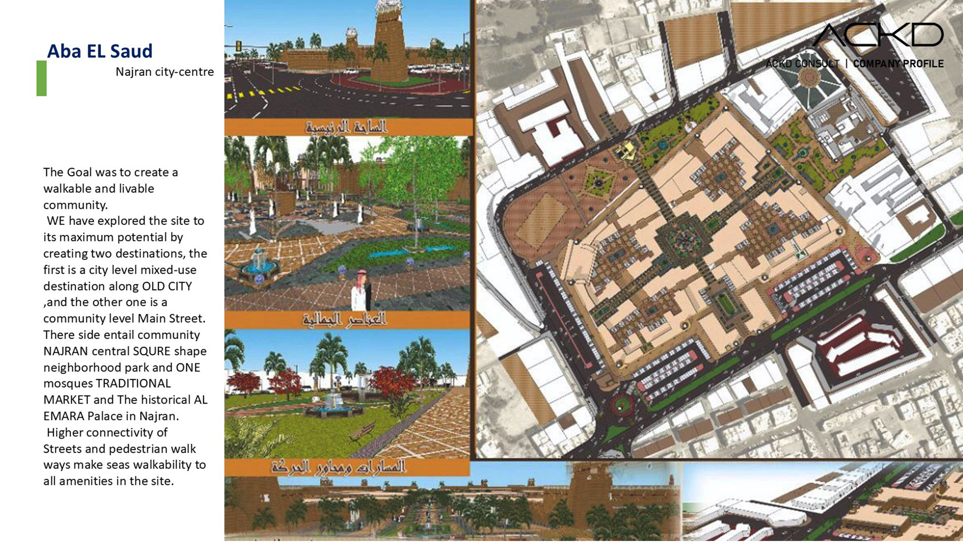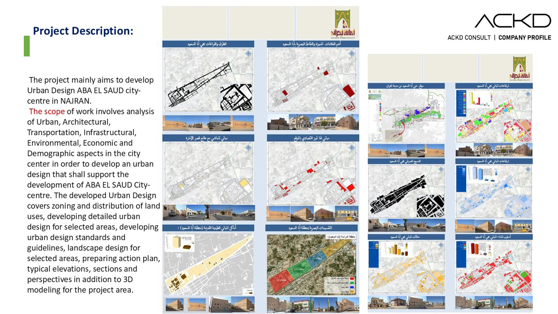 يتضمن نطاق العمل تحليل الجوانب الحضرية والمعمارية والنقلية والبُنية التحتية والبيئية والاقتصادية والديموغرافية في وسط المدينة من أجل تطوير تصميم حضري يدعم تطوير مركز مدينة ABA EL SAUD. يشمل التصميم الحضري المُطور تحديد المناطق وتوزيع استخدامات الأراضي، وتطوير تصميم حضري مفصل للمناطق المختارة، وتطوير معايير وإرشادات التصميم الحضري، وتصميم المناظر الطبيعية للمناطق المختارة، وإعداد خطة عمل، ورفع الواجهات والقطاعات والمناظير النموذجية بالإضافة إلى النمذجة ثلاثية الأبعاد لمنطقة المشروع.
