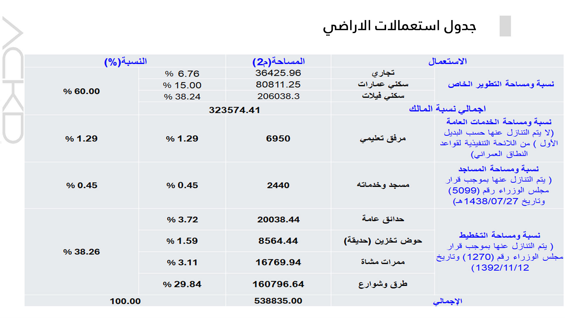 يتميز المخطط السكني بتصميم متوازن يحقق أفضل معايير التخطيط العمراني الحديثة، حيث تم توزيع المساحات بين التطوير الخاص والخدمات العامة بنسبة 60% للتطوير الخاص مقابل 40% للخدمات الأساسية والعامة، بما يضمن بيئة عمرانية متكاملة ومستدامة.
