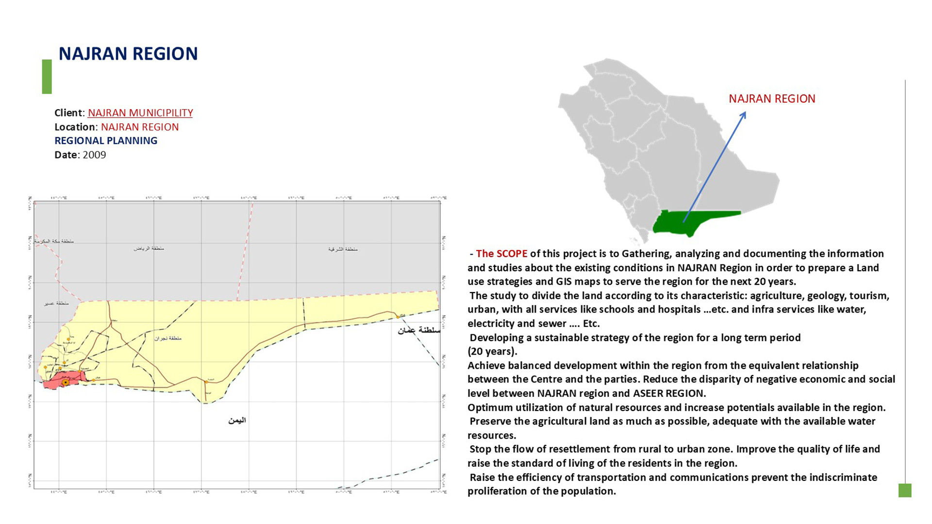 - يهدف هذا المشروع إلى جمع وتحليل وتوثيق المعلومات والدراسات حول الأوضاع القائمة في منطقة نجران بهدف إعداد استراتيجيات استخدام الأراضي وخرائط نظم المعلومات الجغرافية لخدمة المنطقة خلال العشرين سنة القادمة.