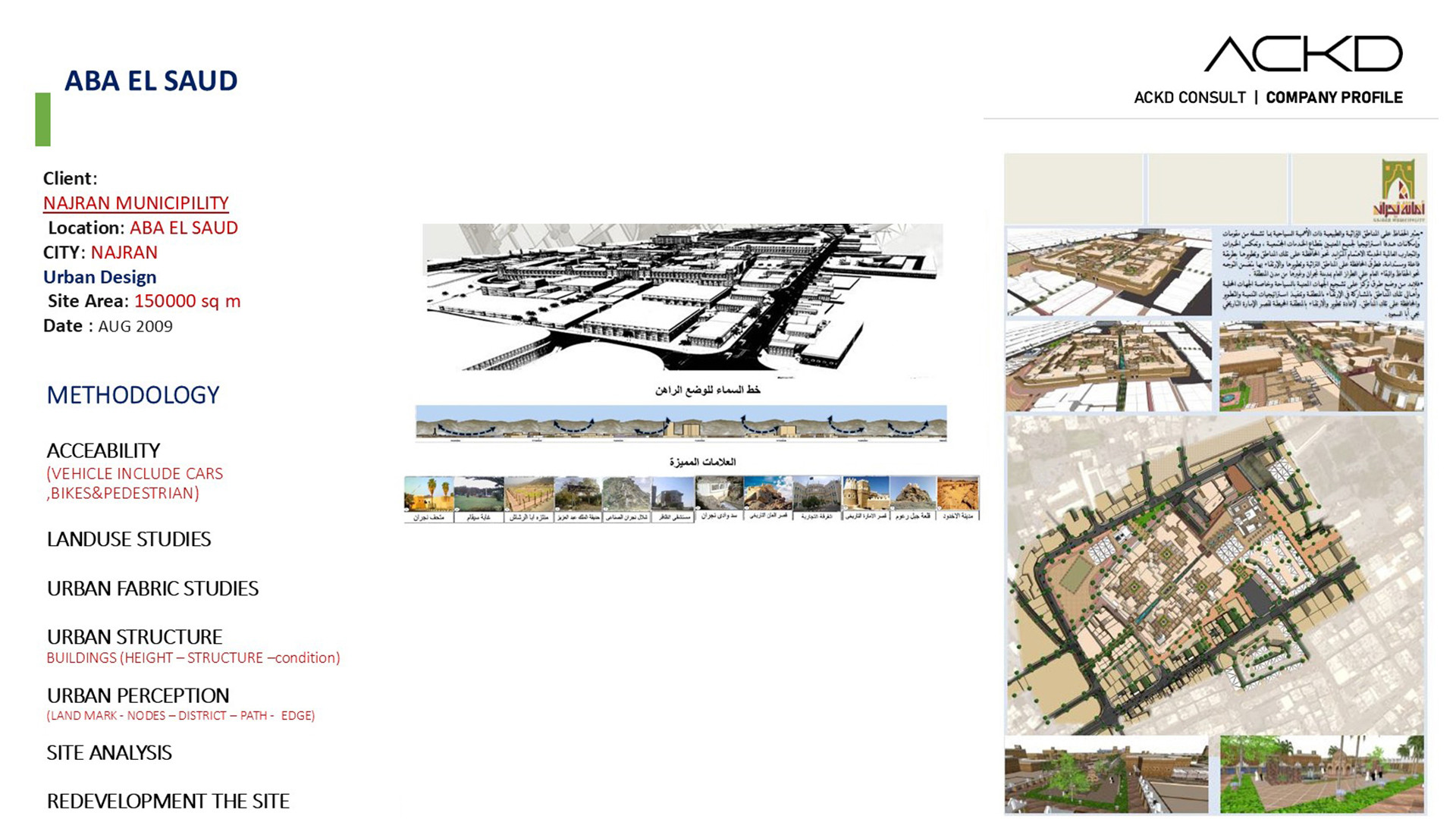 يتضمن نطاق العمل تحليل الجوانب الحضرية والمعمارية والنقلية والبُنية التحتية والبيئية والاقتصادية والديموغرافية في وسط المدينة من أجل تطوير تصميم حضري يدعم تطوير مركز مدينة ABA EL SAUD. يشمل التصميم الحضري المُطور تحديد المناطق وتوزيع استخدامات الأراضي، وتطوير تصميم حضري مفصل للمناطق المختارة، وتطوير معايير وإرشادات التصميم الحضري، وتصميم المناظر الطبيعية للمناطق المختارة، وإعداد خطة عمل، ورفع الواجهات والقطاعات والمناظير النموذجية بالإضافة إلى النمذجة ثلاثية الأبعاد لمنطقة المشروع.